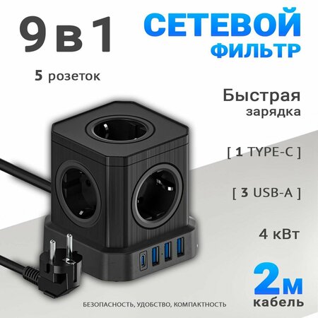 Сетевой фильтр, 5 розеток с 3 USB и 1 TYPE-C быстрая зарядка, кабель 2м, с предохранителем и заземление