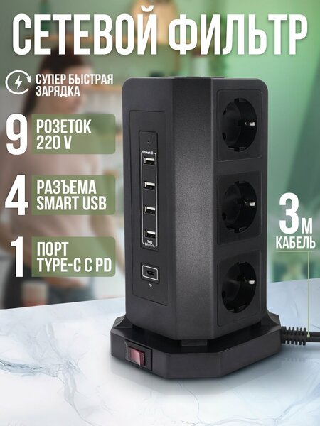 Удлинитель электрический башенного типа с USB и Type-C (с супер быстрой зарядкой 65 Вт)- это незаменимый аксессуар для дома, дачи, квартиры и офиса, который позволяет решить проблему недостаточного количества розеток в любом помещении и подключить большое количество бытовой и офисной техники, техники для кухни, гирлянд на праздники и так далее, а также зарядки телефонов и других гаджетов за счёт того, что в нем имеются не только розетки, но и usb разъемы. Модный и стильный дизайн бытового сетевого фильтра с выключателем бренда AGNI оснащен оптимальным сочетанием разъемов: 9-ю розетками для вилок евростандарт (тип F) и 4-мя ЮСБ Type-A гнездами и 1 Type-C, поддерживающим быструю зарядку, поэтому он станет вашим незаменимым помощником.