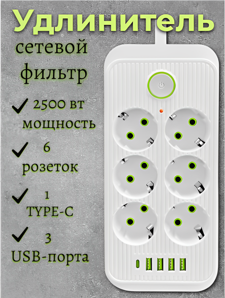Сетевой фильтр с 8 розетками и 4 USB портами обеспечивает надежную защиту вашей техники от скачков напряжения и перегрузок. Максимальная нагрузка составляет 2500 Вт, а номинальная сила тока – 10 А, что позволяет подключать различные устройства, такие как смартфоны, планшеты, ноутбуки и другие. Наличие Type-C порта позволяет заряжать устройства с этим разъемом, а 4 USB порта предоставляют возможность одновременного подключения нескольких устройств. Компактные размеры (высота – 16 см, ширина – 9 см, глубина – 5 см) и стильный белый цвет позволяют легко вписать его в любой интерьер. Корпус изготовлен из качественного ABS пластика. Заземление и адаптер для дополнительной безопасности. Световая индикация и выключатель на корпусе для контроля состояния устройства. Сетевой фильтр произведен в Китае и имеет гарантию на 1 год.