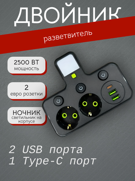 Тройник для розетки с проводом – это удобное и практичное устройство, которое поможет организовать питание нескольких электроприборов. Сетевой фильтр обеспечивает надежную защиту электронных устройств от перенапряжений и перегрузок. Настоящий разветвитель тройник оптимален для дома и офиса. Мощность 2500w позволяет подключать разнообразные устройства, требующие значительных энергозатрат. Встроенный ночник создает комфортное освещение в темное время суток, обеспечивая дополнительные удобства при использовании. Провод от тройника к розетке обеспечивает гибкость в размещении устройств. Сетевой фильтр оснащен предохранителем, что гарантирует безопасность эксплуатации и предотвращает поломку техники при скачках напряжения. Разветвитель тройник имеет USB и type-c гнезда, что позволяет заряжать гаджеты без дополнительных адаптеров. Сетевой филтьтр также включает USB порты для удобного подключения мобильных устройств. Тройник в розетку является отличным выбором для рационального использования пространства и сокращения количества используемых розеток. Сетевой разветвитель выполнен из качественных материалов и рассчитан на долгую службу. Использование современного дизайна позволяет устройству вписаться в любой интерьер. Функциональность устройства расширяется за счет наличия USB портов и интерфейса type-c, которые делают процесс подзарядки смартфонов или планшетов простым и быстрым. Рекомендован к использованию для организации домашнего рабочего места или офиса за счет своей многофункциональности. Тройник с USB столько эффективен, насколько практичен: одно устройство решает множество задач по подключению электроники. Экономьте пространство и увеличивайте эффективность работы ваших электроустройств с этим надежным инструментом распределения электрической энергии.