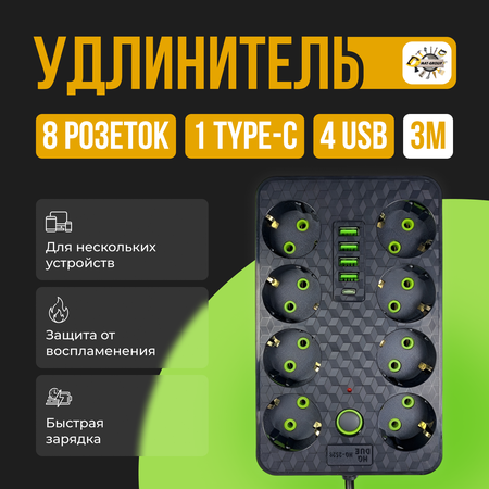 Сетевой фильтр с 8 гнездами и 4 USB 1 Type-C, удлинитель бытовой 3метра 4 USB проёма, Универсальный удлинитель для дома 3 м 4 USB 1 Type-C