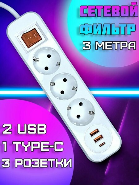 Сетевой фильтр, пилот на 3 розеток (гнезд), а также 2 выхода под USB, один Type-C и длиной провода 3 метров для экономичной защиты широкого спектра бытовой, электрической техники. 3 розетки. Индикатор сети. Крепление на стену. Проводники из чистой меди. Корпус из негорючего пластика. Отлично подойдет для дома и офиса.