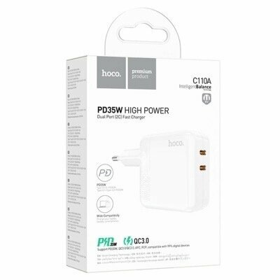 Hoco C110A– сетевое зарядное устройство нового поколения, которое поможет вам сократить время зарядки гаджетов. Поэтому адаптер питания практически не нагревается, потребляет меньше энергии. А еще благодаря тому, что при его изготовлении используют меньшее количество компонентов, его габариты на 30% меньше, чем у кремниевых зарядных устройств. Модель поддерживает все актуальные стандарты быстрой зарядки: Quick Charge 3.0/2.0, Power Delivery до 35 Вт, Huawei Fast Charge FCP, AFC для Samsung, PPS. Зарядка похожа на стандартные адаптеры питания, которые кладут в коробку к смартфону. Но вместо одного разъема у нее два выходных порта USB Type-C. Для начала работы адаптер питания необходимо вставить в розетку, а в разъемы подключить родные зарядные кабели от мобильных устройств, можно сразу два. Оба разъема могут работать параллельно и заряжать сразу два гаджета. Встроенный интеллектуальный чип автоматически определяет может ли ваше устройство заряжаться с повышенным напряжением. Если нет, то запускается обычная зарядка при напряжении в 5 В. Порты Type-C работают по стандарту Power Delivery. PD фирма Apple рекомендует для ускоренной зарядки своей продукции. Обратите внимание, что заряжаемое устройство должно быть подключено с помощью кабеля, поддерживающего стандарт PD. Технология Quick Charge 3.0 реализованная в разъеме USB Type-C позволяет зарядить аккумулятор устройства с 0 до 50% за 25 минут. Обратите внимание, что в этом случае мобильный аппарат тоже должен поддерживать QC 3.0, в ином случае зарядка будет происходить с меньшей скоростью. Многоуровневая защита от скачков напряжения и короткого замыкания, защита от перегрева и перегрузок – делают использование сетевой зарядки безопасным. Hoco C110A совместимо с 99 % существующих гаджетов, для зарядки которых используется кабель с USB Type-C штекером. Дополнительным преимуществом является то, что его можно использовать в любой точке мира - вы можете подключить его ко всем розеткам на 100-240 В. Характеристики: Вход: АС 100-240 В 50/60Hz 0.6A Max Выход: Type-C1/2: 5В-3A/9В-3А/15В-2,33А/20В-1,75А (35 Вт Макс) PPS: 3.3-16В/2,25А (35 Вт Макс) Type-C1 + Type-C2: 17,5 Вт + 17,5 Вт 5В-3А/9В-1,94А/15В-1,16А/20В-0,87А Максимальная выходная мощность 35 Вт Быстрая зарядка Да Количество выходов 2