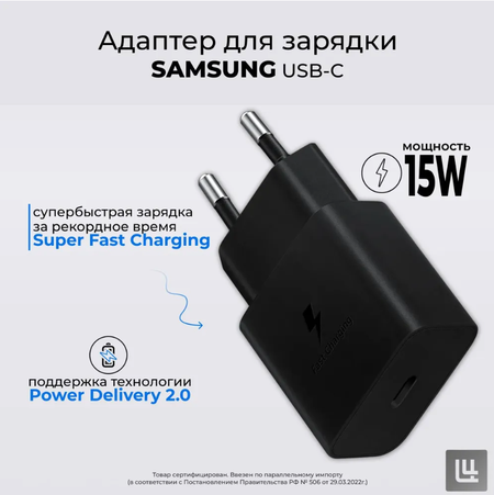 Сетевое зарядное устройство Samsung Type C, с функцией быстрой зарядки (PD 2.0), мощностью до 15 Вт это надежный блок питания, который обеспечит эффективную зарядку вашего устройства. С его помощью вы сможете заряжать свой смартфон, планшет или другие устройства, поддерживающие данный стандарт зарядки, с высокой скоростью и безопасностью. Сетевой адаптер имеет компактный и портативный дизайн. Это делает зарядный блок питания Samsung идеальным сопутствующим аксессуаром для путешествий или повседневного использования. Вы сможете легко положить Travel Adapter Samsung в сумку или карман и иметь доступ к быстрой зарядке в любое время и в любом месте. Сетевое зарядное устройство Samsung USB-С также обеспечивает высокую степень безопасности и защиты от перегрева, короткого замыкания и перенапряжения. Вы можете быть уверены, что ваше устройство будет заряжаться безопасно и надежно. Зарядка Samsung 15 Вт может быть использовано для различных моделей смартфонов, планшетов и других устройств, что делает его универсальным и удобным аксессуаром. Совместим со стандартными кабелями USB Type-C. Для оптимальных результатов используйте оригинальные кабели производства компании Samsung. Реальное время зарядки может зависеть от фактического использования, условий зарядки, подключенных устройств и других факторов. Надлежащей зарядке устройства могут мешать такие факторы, как подключенное устройство, кабель и условия зарядки. Этот универсальный Тревел адаптер станет отличным и нужным подарком для коллег, друзей и близких. Поддержка функции быстрой зарядки Adaptive Fast Charging (быстрая зарядка для устройств Samsung до 15 Вт) и Power Delivery 2.0. Входное напряжение: 100-240 В Выходное напряжение: 5-9 В Сила выходного тока: 2 A