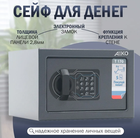 Сейф Aiko T-170 EL – это компактный сейф, рассчитанный на хранение документации, печатей, сумм денег, травматического оружия и прочих вещей, доступ к которым желательно ограничить. Сейфы Aiko целиком отвечают требованиям МВД РФ к хранению короткоствольного оружия. Модель Aiko T-170 EL представляет собой прочное сварное изделие из стальных листов ; дверь усилена за счёт лицевой панели в 2.8 мм. Запирается электронным замком PLS-3, к которому прилагается мастер-ключ для аварийного открывания. Замок кодируется сочетаниями из четырёх-шести цифр. Дизайн поверхности – предохраняющее от мелких повреждений специальное покрытие графит (RAL 7024) с эффектом молотковой эмали. Анкерное отверстие в задней стене предусмотрено.