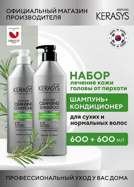 Набор "Шампунь + Кондиционер" от перхоти Kerasys: эффективное лечение и увлажнение кожи головы. Набор "Шампунь + Кондиционер" от перхоти Kerasys представляет собой профессиональный уход за волосами в домашних условиях. В него входят два продукта объемом 600 мл каждый: лечебный шампунь и кондиционер. Основной компонент набора - натуральный экстракт розмарина, который обладает антиоксидантными и антибактериальными свойствами. Он способствует заживлению и увлажнению сухой кожи головы, улучшает циркуляцию крови в коже, что положительно сказывается на состоянии волосяных луковиц и кожи головы. Лечебный шампунь содержит климбазол, салициловую кислоту, экстракты хвои и розмарина, которые эффективно устраняют перхоть и предотвращают ее появление. Протеины пшеницы в составе шампуня заботятся о гладкости и кондиционировании волос. Кондиционер дополнительно увлажняет и питает волосы, делая их гладкими и блестящими. После использования набора ваши волосы приобретут ухоженный и здоровый вид. Набор Лечебный против перхоти Шампунь + Кондиционер 600 мл + 600 мл. Лечебный увлажняющий набор KeraSys - ваш идеальный выбор для лечения кожи головы. Если у вас сухая и чувствительная кожа головы, склонная к шелушению и зуду, то этот набор шампунь + кондиционер - именно то, что вам нужно. Он не только эффективно удаляет перхоть, но и увлажняет вашу кожу и волосы, делая ваши волосы красивыми и здоровыми. Основным компонентом этого набора является натуральный экстракт розмарина. Благодаря своим антиоксидантным и антибактериальным свойствам, он обеспечивает заживление и увлажнение сухой кожи головы. Кроме того, розмарин способствует улучшению циркуляции крови в коже головы, что положительно сказывается на состоянии кожи и волосяных луковиц. Лечебный увлажняющий шампунь KeraSys содержит климбазол, салициловую кислоту, экстракты хвои и розмарина, которые эффективно устраняют и предотвращают появление перхоти и зуда. Протеины пшеницы в составе заботятся о гладкости и кондиционировании волос. Кондиционер дополнительно увлажняет и напитывает волосы, делая их гладкими и блестящими. После использования этого набора ваши волосы ухоженный и здоровый вид. KeraSys - это профессиональный уход за волосами в домашних условиях. Наши шампуни и кондиционеры сертифицирован и гарантируют вам высокое качество. Kerasys - это бренд, который зарекомендовал себя на рынке профессиональной косметики для волос. Все продукты бренда сертифицированы и гарантируют высокое качество.