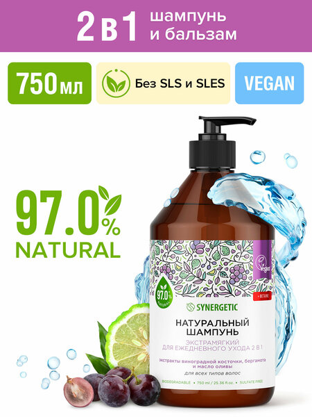 Бессульфатный шампунь SYNERGETIC «Экстрамягкий для ежедневного ухода 2 в 1» — эффективное средство для очищения кожи головы и всех типов волос — более чем на 98% состоит из натуральных компонентов. Шампунь деликатно очищает, эффективно ухаживает за волосами и защищает кожу головы. Благодаря формуле 2 в 1 бальзам в составе шампуня облегчает расчесывание, придает волосам эластичность, смягчает и увлажняет их. Формула с бетаином восстанавливает поврежденные волосы, укрепляет и стимулирует их рост. Натуральный шампунь содержит комплекс масел миндаля и оливы, который восстанавливает волосы, придает им мягкость и эластичность. Активные компоненты в составе шампуня укрепляют волосы и стимулируют восстановление кератиновых волокон. Экстракты виноградной косточки, бергамота и мелиссы нормализуют баланс кожи головы. Мультифункциональный компонент натурального происхождения софоролипид мягко очищает кожу головы и сохраняет естественный микробиом, а инновационный увлажняющий комплекс усиливает барьерные свойства кожи и обеспечивает до 72 часов глубокого увлажнения. Физиологичный уровень pH 5,5 устраняет сухость кожи головы и гарантирует безопасность при частом использовании средства даже для чувствительной кожи. Натуральный шампунь не содержит SLS, SLES, парабенов, силиконов, минеральных масел и красителей, а также компонентов животного происхождения, не тестируется на животных и сертифицирован британской организацией The Vegan Society. Знак Vegan — мировой стандарт этичной продукции.