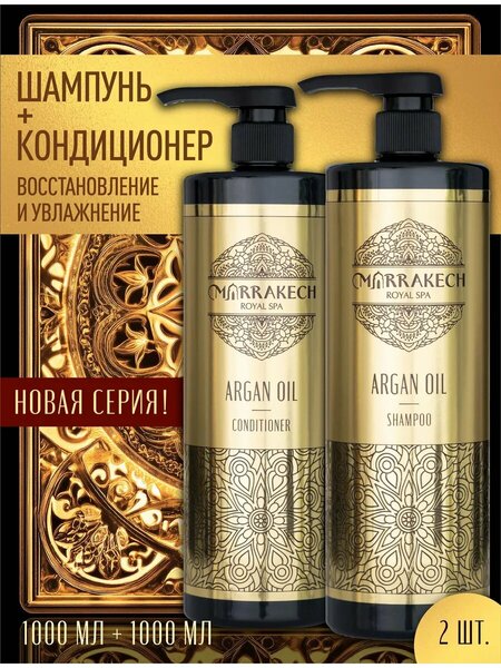Новый набор для ухода за волосами женщине профессиональный: увлажняющий шампунь и кондиционер для волос Argan Oil – это сразу два сокровища из жаркого Востока в составе: драгоценное масло аргании и вулканическая глина гассул. С древних времен эти компоненты входили в рецепты красоты восточных красавиц, оберегая их красоту от суровой пустыни. глина гассул – природный источник кремния, магния, железа, цинка, калия. Она прекрасно мылится, так что само название Ghassoul переводится как «мыться». Глина для волос – замечательное средство против воспалений, раздражений кожи головы. Благодаря ему, кондиционер и шампунь очищающий профессиональный наполняют волосы энергией и силой, а использование глины не приводит к пересушиванию. Кондиционер бальзам и глубоко очищающий шампунь для волос профессиональный Argan Oil включают также экстракты льна и чёрного тмина для гладкости и блеска. Набор для ухода за волосами Арган Ойл оказывает себорегулирующее действие, уплотняет волосы, помогает им дольше оставаться чистыми, придает блеск. Шампунь для волос восстанавливающий, очищающий глубоко и бережно, и кондиционер, наполняющий силой минералов, представляют собой базовый набор для ежедневного ухода. Тонкий восточный аромат превратит прием ванны или душа в ещё один приятный момент вашей жизни и надолго останется на ваших локонах. Набор шампунь без сульфатов и парабенов и кондиционер женский 1 литр с дозатором Арган Оил может использоваться в домашнем или профессиональном уходе для любого типа волос, идеально подойдет женщине, девушке или девочке, детский нарощенный волос будет напитан маслами . Высокое качество, эффективность, выгодный объем 1000 мл и эстетичная премиальная упаковка в восточном стиле сделают набор шампунь и бальзам подарочный женский отличным вариантом для подарка. Базовый набор Argan Oil прекрасно подходит для знакомства с брендом. Вы сможете расширить свою золотую коллекцию нашей хорошей маской и спреем, кремом для тела, мылом для рук, гелем для душа. Ищите другие наборы Арган Ойл!