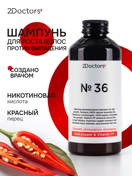 Шампунь с красным перцем 36 от 2Doctors - шампунь профессиональный для волос. Этот продукт был создан как шампунь для волос женский профессиональный. Но он показал себя и как отличный шампунь мужской для волос. Это идеальное решение для всех, кто мечтает о густых, сильных и здоровых волосах. Шампунь против выпадения волос от 2Doctors — это бессульфатный шампунь для роста волос, который: - Стимулирует рост волос - От выпадения волос - Для укрепления волос - Для гладкости волос - Для густоты волос - От облысения для мужчин Шампунь бессульфатный и имеет сбалансированный состав: * экстракт красного перца, который активизирует обмен веществ в волосяных луковицах, способствует росту новых волос. * Репейное масло: проникает в корни волос, укрепляет их, избавляет от сухости и шелушения кожи головы. * Касторовое масло: борется с секущимися кончиками, стимулирует рост волос, насыщает их витаминами и борется с перхотью. * Витамин РР (никотиновая кислота): ускоряет кровообращение в коже головы, улучшает питание волосяных луковиц, стимулирует их рост и предотвращает выпадение волос. * Отвары крапивы и лопуха: создают мощный тандем для укрепления волос по всей длине, делая их более плотными и послушными. Отвары также придают волосам блеск и сияние, увлажняют кожу головы, способствуя росту здоровых волос. Шампунь для волос мужской от от 2Doctors мягко разогревает кожу головы. Смывать рекомендуем так, чтобы шампунь для роста волос не попал в глаза, так как в составе есть частицы красного перца. Создатель продукта врач дерматолог, который имеет профессиональный стаж более 20 лет. Позвольте себе иметь здоровые, сильные и роскошные волосы с шампунем №36 от 2Doctors.