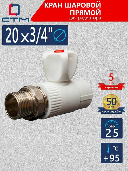 Кран шаровой PP-R CPRS2034 для радиатора прямой 20х3/4" СТМ пласт предназначен для подключения радиатора к трубопроводу из полипропиленовых труб и позволяет перекрывать поток теплоносителя через радиатор. Кран можно использовать в трубопроводах систем питьевого, хозяйственно-бытового и промышленного назначения, систем холодного и горячего водоснабжения. Подключение крана 20 мм на 3.4 дюйма к радиатору производится с помощью латунного никелированного полусгона, закрепленного на закладной детали накидной гайкой. Монтаж осуществляется методом раструбной сварки. Изготавливается из полипропилена (Polypropylene random copolymer – полипропилен тип 3). Материал экологически безвреден и не выделяет вредных веществ при эксплуатации. Водопровод из полипропиленовых труб и фитингов не меняет вкус, запах и цвет протекающей жидкости. Максимальное рабочее давление 25 Бар. Максимальная температура рабочей среды +95С. Срок службы - до 50 лет.