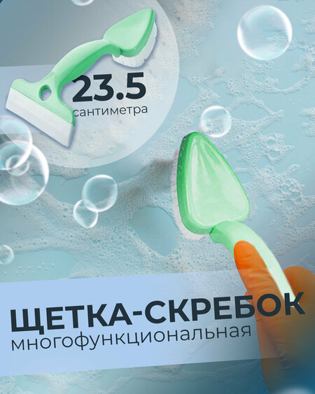 Многофункциональная хозяйственная щетка 2 в 1 для уборки кухни и ванной. Размер: 10.5х23.5х8 см. Материал щетин - сверхпрочный и гибкий силикон, устойчивый к агрессивным моющим средствам, эргономичная ручка из АВS-пластика. На руках не останется ни капли жидкости и жира! Сторона для сгона воды силиконовой щётки облегчит процедуру мытья окон в квартире. Действительно полезная в хозяйстве вещь. Отмывая любую поверхность, она не повредит столешницу, стеклокерамику, стены и зеркала, не оставит царапин на индукционной плите. Универсальная хозяйственная щётка для уборки с ручкой эффективно заменит сразу несколько приспособлений, моментально справившись с любой грязью. Это одновременно удобная кухонная щётка для мытья посуды, щётка для мытья окон и щетка для кухни. Мигом удаляет пятна с кафеля и варочной панели, проникая в стыки и микрощели. Нужен классный скребок для стеклокерамики и водосгон для окон? Этой модели под силу любая задача! Максимально удобная щетка для мытья окон, зеркал и других гладких поверхностей. Легкая и компактная щетка для мытья подойдет для мытья окон, стекол и зеркал, плитки и кафеля в ванной и на кухне, душевых кабин, стекол и зеркал автомобиля. Водосгон в разы сокращает время уборки ванной комнаты. Эта кухонная щетка справится с грязью без царапин и разводов. Рукоятка скребка для окон не впитывает влагу, не гниет и не создает неприятного запаха. Мягкая резинка стекломоя плотно прилегает к поверхности, полностью повторяя ее форму поэтому мгновенно удаляет влагу, без разводов!