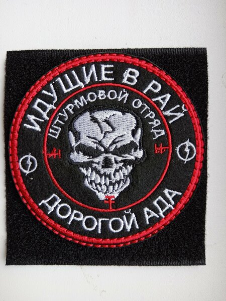 Шеврон на липучке "Идущие в Рай дорогой Ада" размер 9см. Вышит на черной шевронной ткани. Плотное плетение вышивки создает яркий и четкий рисунок. Плотное плетение вышивки создает яркий и четкий рисунок. Специализированные вышивальные нити не выгорают на солнце, не линяют и не выцветают даже после большого числа стирок. Для крепления на одежду с обратной стороны шеврона пришита жесткая липучка. Ответная часть липучки "мягкая" идет в комплекте с шевроном. Текстильный патч крепится на одежду, рюкзак, сумку и другие изделия.