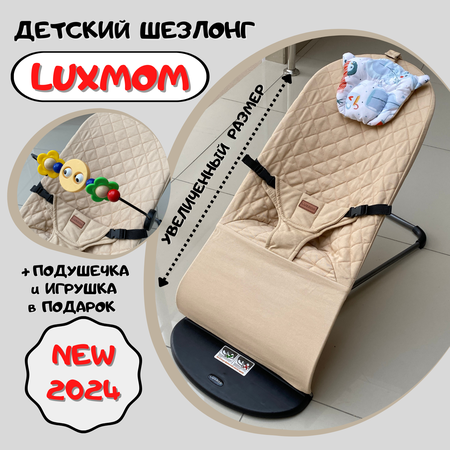 Шезлонг для новорождённых LUXMOM предназначен для детей с рождения, весом от 3,5кг. Увеличенная конструкция длиной 94 см позволит использовать шезлонг дольше, чем стандартный. Данная модель выдерживает нагрузку до 20 кг, а так же подойдет для малышей до 85 см по росту. Предусмотрено три положения: нижнее 3,5-7 кг, среднее 7-15 кг, верхнее 10-20 кг. Анатомически правильный крой чехла равномерно распределяет вес, снимая нагрузку с шеи и спины ребёнка. Ортопедическая подушечка обеспечивает поддержку головы новорожденного малыша. Ребенок своими движениями приводит кресло-шезлонг в действие. Быстро и компактно складывается для транспортировки и хранения. Вес шезлонга 1,9 кг. Чехол изготовлен из 100% хлопка, легко снимается для стирки. Рекомендуем деликатный режим с температурой не более 40 градусов. Отличным дополнением шезлонга станет интерактивная дуга-игрушка, которая идёт в подарок.