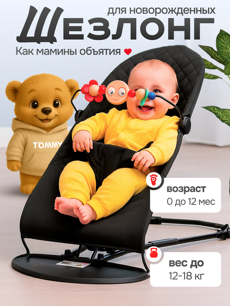 Представляем Вам замечательный детский шезлонг для новорожденных TOMMY FLUFF! Этот очаровательный помощник создан с любовью к самым маленьким и станет настоящим другом для Вашей семьи с первых дней жизни малыша. Представьте себе: уютная качалка, которая нежно убаюкивает кроху, словно мама или папа. Этот чудесный лежак создан специально для детишек от рождения до годика, чтобы каждый момент их раннего детства был наполнен комфортом и радостью. Волшебство этой модели кроется в ее многофункциональности! Мягкая регулируемая спинка с тремя положениями наклона позволяет превратить шезлонг то в уютную люльку для сна, то в удобное пространство для бодрствования. Когда малышу захочется поиграть или понаблюдать за происходящим – поднимите спинку повыше. Для кормления и спокойного отдыха идеально подойдет среднее положение, а для сладких снов – самое горизонтальное. Над этой уютной качелькой раскинулась красочная дуга с развивающими игрушками. Они не только развлекают кроху, но и помогают развивать координацию, восприятие цветов и форм. Каждое прикосновение к игрушкам – это маленькое открытие для любознательного малыша! Мы позаботились о безопасности: мягкий, но надежный ремень бережно удерживает ребенка, а прочная конструкция выдерживает нагрузку от 12 до 18 кг в зависимости от положения спинки (ВНИМАНИЕ! Для безопасности Вашего рекомендуем ознакомиться с инструкцией и учитывать весовые ограничения). Габариты (78х59х38,5 см) и удобное складывание до компактных размеров 90х38,5х10 см делают шезлонг отличным спутником в поездках – можно взять с собой в гости или на дачу! FLUFF от TOMMY – это уютный уголок, где Ваш малыш будет расти, развиваться и познавать мир в атмосфере любви и заботы. Пусть каждый день Вашего крохи будет наполнен теплом и нежностью в объятиях этой чудесной колыбели!