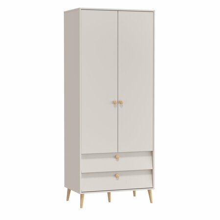 распашной шкаф для одежды с двумя выдвижными ящиками; под отделением с дверями расположены два выдвижных ящика; ящики на шариковых направляющих полного выдвижения; деревянные ручки круглой формы, выполненные в цвете бук; установлен на высокие опоры из массива бука, с высотой ножек 16 см