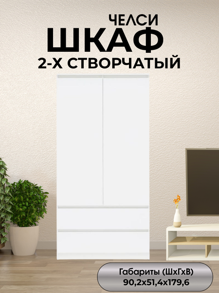 Стильный и функциональный шкаф «Челси»: идеальный выбор для Вашего интерьера! Cовременный двухстворчатый шкаф «Челси» с двумя удобными выдвижными ящиками внизу. Эта модель сочетает в себе изысканный дизайн, отличное качество изготовления и высокую функциональность, благодаря чему станет идеальным решением для хранения одежды и аксессуаров в Вашей спальне или гардеробной комнате. Фасад выполнен в популярном стиле минимализма с использованием белого глянцевого покрытия холодных оттенков, придающего изделию эффект роскоши и современности. Широкий дверной проем и удобное расположение штанг позволят аккуратно расположить всю одежду и обувь. Два нижних ящика оборудованы шариковыми направляющими, обеспечивая плавное и тихое выдвижение. Корпус и фасады выполнены из прочного и экологичного ЛДСП, покрытого защитным слоем, устойчивым к царапинам и загрязнениям. Габаритные размеры модели составляют всего 90,2×51,4×179,6 см, что позволяет установить шкаф даже в небольших помещениях, экономя полезное пространство. Благодаря лаконичному дизайну шкаф идеально впишется в любое помещение, будь то классическое оформление спальни или современное направление дизайна. Конструкция выполнена компактно, однако обладает большой вместительностью, позволяя разместить максимальное количество вещей. Производитель предоставляет гарантию сроком на 12 месяцев, подтверждая высокий уровень продукции и свою заботу о клиентах. Выбирайте мебель высокого класса, удобную в использовании и долговечную в эксплуатации! Купив шкаф «Челси», Вы получите не только стильный элемент декора, но и надежного помощника в деле поддержания порядка и комфорта в Вашем доме. Наслаждайтесь идеальной организацией пространства и гармоничностью интерьера с нашим современным шкафом «Челси»!