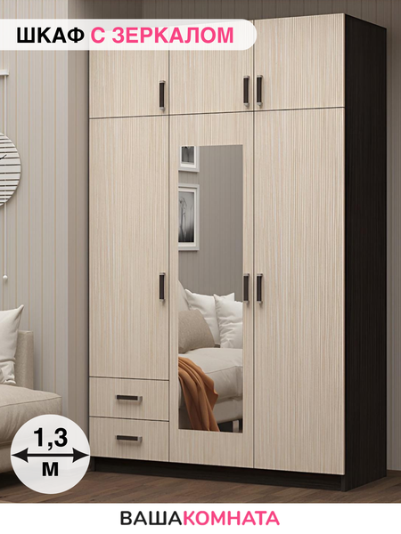 Шкаф 3-створочный с 2-мя ящиками - это удобный и функциональный элемент мебели, который станет незаменимым помощником в вашем доме. Шкаф выполнен в классическом стиле, что позволяет ему гармонично вписаться в любой интерьер. Цвет шкафа - Венге, что придает ему строгость и элегантность. Конструкция шкафа включает в себя три распашные двери, две из которых оснащены зеркалами. Это позволяет не только хранить одежду, но и всегда быть в курсе своего внешнего вида. Внутри шкафа предусмотрено четыре полки и два вместительных пространства с дверками. Это позволяет разместить большое количество вещей и аксессуаров. Шкаф изготовлен из качественного ЛДСП, что гарантирует его долговечность и надежность. Фурнитура выполнена из металла и пластика, что обеспечивает прочность и устойчивость к износу. Шкаф поставляется в разобранном виде, что облегчает его транспортировку и установку. Выбирая шкаф 3-створочный с 2-мя ящиками, вы получаете не только стильный и функциональный элемент мебели, но и надежного помощника в организации пространства вашего дома.