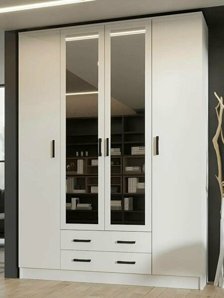 Шкаф квадро — это стильное и функциональное решение для вашего дома, дачи или офиса. Созданный с вниманием к деталям, он обеспечивает высокую вместительность и организованность ваших вещей. Центральные дверцы украшены зеркалом, что визуально расширяет пространство комнаты и добавляет дополнительное удобство для утренних сборов. Внутри шкафа находятся штанги для развешивания одежды, что идеально подходит для хранения рубашек, платьев и костюмов. Просторные полки и удобные выдвижные ящики предоставляют достаточно места для размещения обуви, аксессуаров и других личных вещей.