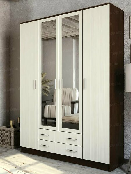 Корпус шкафа, 4 дверцы шкафа, 2 зеркала, 2 ящика, схема сборки. Вся фурнитура включена в комплект.