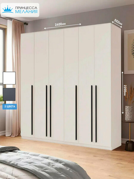 Шкаф для одежды 6-ти дверный Принцесса Мелания в белом цвете - это стильное и функциональное решение для любого интерьера. Этот шестидверный шкаф распашной изготовлен из высококачественных материалов, что обеспечивает его надежность и долгий срок службы. Шкаф белого цвета Принцесса Мелания отличается элегантным дизайном, который подойдет как для прихожей, так и для спальни, детской или гостиной. Он оснащен стильными металлическими ручками, которые добавляют изысканности его внешнему виду. Этот гардероб с встраиваемыми тумбами, выдвижными ящиками, полками и штангами для вешалок предлагает удобное хранение одежды и аксессуаров. Ящики оснащены бесшумными направляющими, что делает использование шкафа максимально комфортным. Размеры данного шкафа составляют 2200х2400х520 мм, что позволяет разместить в нем большое количество одежды без перегрузки пространства. Белый цвет создает ощущение легкости и простора в помещении. Шкаф для одежды Принцесса Мелания - это не только функциональная часть интерьера, но и элемент стиля вашего жилища. Его универсальность позволяет использовать его по назначению или адаптировать под свои потребности.