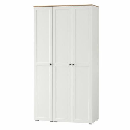 состоит из пенала и шкафа; пенал имеет два варианта наполнения - 6 полок или штанга с антресольной и нижней полочками, универсальная сборка двери - может быть установлена как на левую, так и на правую сторону; шкаф с двумя распашными дверьми, в верхней части антресольная полка, под ней горизонтальная штанга для одежды на плечиках, полка и ниша внизу; четырехшарнирные петли без доводчиков; регулируемые опоры; лицевая фурнитура в виде черных аккуратных ручек на фасадах.