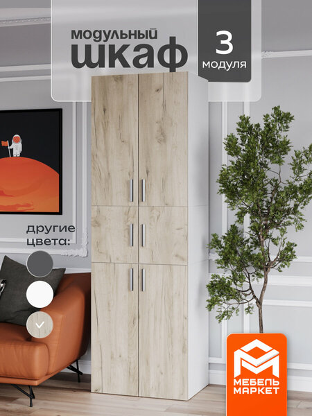 Шкаф распашной состоит из 3 модулей, в верхнем модуле расположена металическая хромированная овальная штанга для плечиков и нижнем широкие и глубокие полки. Шкаф пенал состоящий из 3 модулей компактный и вместительный, что обеспечивает удобство использования и экономит пространство.