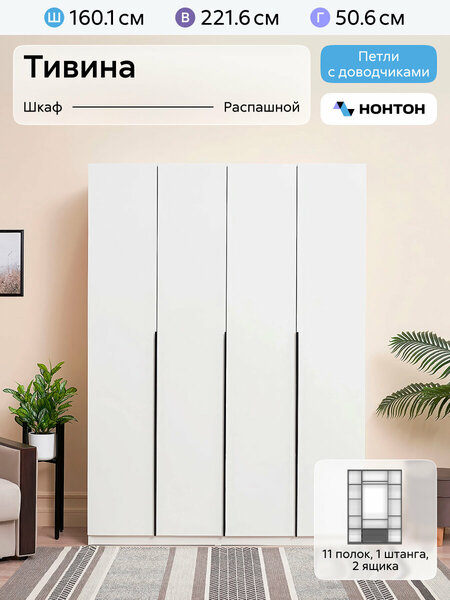 Шкаф для одежды Тивина – это современное и функциональное решение для хранения одежды. Изготовленный из качественного ЛДСП, он обладает прочным корпусом. Особенностью данной модели является конструкция, которая позволяет максимально эффективно использовать пространство в комнате. Шкаф распашной оснащен дверями, за которыми находятся штанга для вешалок, полки и ящики с шариковыми направляющими. Это обеспечивает удобное размещение одежды и аксессуаров. Этот шкаф четырехстворчатый имеет ширину 160.1 см и высоту 221.6 см, что позволяет разместить в нем большое количество вещей. При этом глубина составляет 50.6 см, это обеспечивает достаточное пространство для хранения вещей. Шкаф в прихожую выполнен в современном стиле и цвете, благодаря чему он может гармонично вписаться в любой интерьер, сочетаясь с комодом, прикроватной тумбой, кроватью и другой мебелью. Выбирая шкаф Тивина от бренда Нонтон, вы получаете стильное, функциональное и надежное решение для хранения одежды.