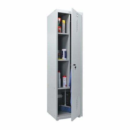 Предназначены для хранения рабочей одежды и хоз. инвентаря в производственных, спортивных и других помещениях, а также для организации камер хранения. • ключевой замок «Практик» (2000 комбинаций) • вентиляционные отверстия • конструкция шкафов позволяет скреплять их между собой • возможность установки двери с правым или левым открыванием (по желанию заказчик изменяет направление открывания двери) • комплектация: вертикальная перегородка, 3 полки под хозяйственный инвентарь, держатель для швабры, крючки для одежды, перекладина для плечиков • в комплект поставки входят четыре регулируемые опоры (диапазон регулировки – 30 мм) • высота с установленными опорами – 1870 мм • поставляются в разобранном виде Размеры внешние, мм (ВхШхГ): 1830x500x500 Вес, кг: 26 Тип замка: ключевой Цвет: Cерый полуматовый (RAL 7038) Тип покрытия: Порошковое Количество секций: 1