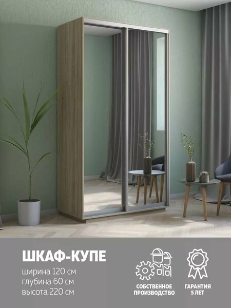 Шкаф-купе "Экспресс" с двумя дверями из ДСП с зеркалами — это идеальное решение для организации пространства в вашем доме. С размерами 120x60x220 см, он прекрасно впишется как в прихожую, так и в спальню, обеспечивая удобное хранение одежды и других личных вещей. Этот шифоньер оснащен полками, которые позволяют рационально использовать внутреннее пространство, а также зеркалом, что добавляет функциональности и визуально расширяет помещение. Шкаф-купе выполнен из высококачественного ДСП, что гарантирует его долговечность и устойчивость к внешним воздействиям. Дизайн шкафа продуман до мелочей: раздвижные двери обеспечивают легкий доступ к содержимому, не занимая лишнего места, что особенно важно для небольших помещений. Зеркала не только служит практичной деталью, но и помогает визуально увеличить пространство, делая его более светлым и просторным. Этот шкаф станет отличным дополнением к вашей мебели, гармонично сочетаясь с любым интерьером. Он подходит для хранения как повседневной одежды, так и сезонных вещей, обеспечивая порядок и удобство. Полки внутри шкафа позволяют организовать пространство по вашему усмотрению, создавая идеальные условия для хранения различных предметов. Шкаф-купе "Экспресс" — это не просто мебель, а функциональное решение для вашего дома. Он поможет создать уют и порядок в прихожей или спальне, обеспечивая легкий доступ к необходимым вещам. Выбирая этот шкаф, вы получаете надежное и стильное решение для хранения одежды и аксессуаров.