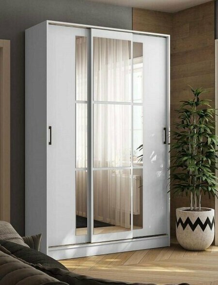 Трёхдверный шкаф-купе Тайм ШКК-03 представляет собой сочетание практичности и функциональности. Это оптимальный вариант с точки зрения эргономики пространства. Раздвижные створки снабжены удобными ручками, створки декорированы зеркалом с еврокромкой, которое создаёт иллюзию расширенного пространства. Внутри с одной стороны находятся четыре просторные полки для хранения вещей и постельного белья, с другой стороны – вместительная зона хранения с горизонтальной хромированной штангой для одежды на вешалках. Максимальная нагрузка на полку - 10 кг.