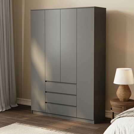 Габариты: Высота: 2100 мм. Ширина: 1604 мм. Глубина: 504 мм. Цвет: Графит матовый Материал корпуса: ЛДСП Материал фасада: ЛДСП Отличительной особенностью данной модели является отсутствие ручек - роль ручек выполняют сами фасады. Нижние кромки оборудованы пластиковыми подпятниками для защиты пола от повреждений. Шкаф поставляется в разобранном виде в надежной упаковке, с комплектом сборочной фурнитуры и инструкцией по сборке.
