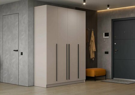 Распашной шкаф Берген – отличный вариант для квартиры, загородного дома, коттеджа или офиса. Его можно поставить в прихожую (коридор), гостиную (зал), спальню и даже детскую комнату. Четырехстворчатый шкаф имеет универсальный вариант для хранения: на боковых полках можно разместить нижнее белье, одежду, постельное белье, а на горизонтальной штанге развесить одежду на вешалках. Сочетание платяного и бельевого отсеков позволяет использовать шкаф в качестве комбинированного. Размеры шкафа: ширина – 160 см, высота – 220 см, глубина – 52 см. Длина ручки – 1024 мм каждая. Материал: корпус и фасады – ЛДСП, ручка – пластик. Цвет: кашемир. Способ установки: напольный. Ширина штанги 76 см. Ширина центральной полки 77 см, боковых полок - 38 см.
