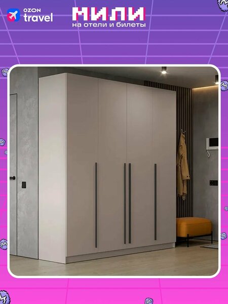Распашной шкаф Берген – отличный вариант для квартиры, загородного дома, коттеджа или офиса. Его можно поставить в прихожую (коридор), гостиную (зал), спальню и даже детскую комнату. Четырехстворчатый шкаф имеет универсальный вариант для хранения: на боковых полках можно разместить нижнее белье, одежду, постельное белье, а на горизонтальной штанге развесить одежду на вешалках. Сочетание платяного и бельевого отсеков позволяет использовать шкаф в качестве комбинированного. Размеры шкафа: ширина – 200 см, высота – 220 см, глубина – 52 см. Длина ручки – 1024 мм каждая. Материал: корпус и фасады – ЛДСП, ручка – пластик. Цвет: кашемир. Способ установки: напольный.