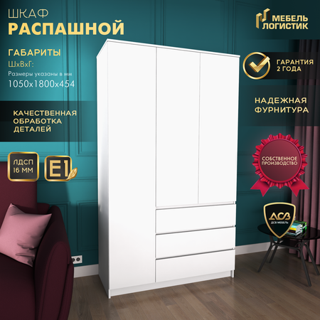 Данный распашной шкаф небольшой, но многофункциональный и современный. Корпус и фасады выполнены из ЛДСП белого цвета. Состоит шкаф из центральной части, с широкими и достаточно глубокими полками, и нижней части с выдвижными ящики на роликовых направляющих. Шкаф распашной - это идеальное решение для стильной и функциональной прихожей. Удобство использования и эстетическое оформление - главные преимущества этого шкафа. Шкаф для одежды - небольшой, но вместительный шкаф с тремя распашными дверцами и выкатными ящиками. Трехдверный шкаф имеет следующие характеристики и особенности: - стильный и простой дизайн: сочетание деталей в современном оттенке в шведском стиле. Также напольный двухстворчатый шкаф можно дополнять другими модулями, создавая свой уникальный интерьер прихожей, гостиной, спальни или офиса. Достаточное количество полок внутри шкафа позволят разместить различные предметы от книг и игрушек до верхней одежды. - функциональность и хранение: шкаф имеет два отсека: правый оснащен вместительными полками, левый – вешалкой и основным большим отделением для одежды, куда можно поместит до 10 вешалок. Напольный шкаф высокий и вместительный, что позволяет экономить пространство в прихожей или небольшом кабинете, в салоне красоты. - прочная конструкция: шкаф имеет надежную конструкцию и изготовлен из прочных и экологически безопасных материалов, гарантирующих его стабильность и долгий срок службы. Состоит шкаф из центральной части, с широкими и достаточно глубокими полками, и нижней части с выдвижными ящики на роликовых направляющих. Боковая часть оснащена полками и штангой для плечиков. - Створки (дверцы) шкафа для одежды открываются при помощи системы PUSH-TO-OPEN. Открывание ящиков и створок, производится за счет пространства между планками и фасадом. На фасадах ящиков и центральных створках отсутствуют ручки, функцию ручек выполняет сам фасад (фасады с внутренней стороны прямые под углом 90). Качественный материал: - материал корпуса - ЛДСП 16мм; - материал задней стенки - лхдф белый; - кромка - ПВХ 0,4 мм; - материал фасадов-ЛДСП 16мм. Габариты: 1050х1800х45,4 мм Шкаф распашной в спальню может стать отличным дополнением для вашего интерьера как современный многофункциональный шкаф. Вы сможете поставить этот модульный шкаф не только в спальню, но и в гостиной или прихожую. Отсутствие лицевой фурнитуры подчеркнет индивидуальность вашего помещения, добавив нотку изыска и элегантности вашего дома, детской комнаты, прихожей. Шкаф купе для одежды отлично подойдет для комнаты подростка. Мебель доставляется в разобранном виде, в упаковке. Инструкция по сборке прилагается.