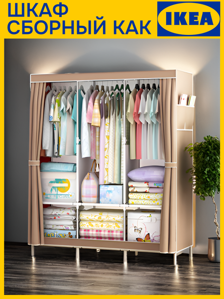 Шкаф из ткани каркасный бежевый - это закрытая система хранения для вещей, одежды, игрушек. Размер шкафа - ширина 130см, глубина 45см, высота 170см. Он имеет узкую конструкцию, что позволяет сэкономить место в вашей комнате или гардеробной. Шкаф имеет 6 полок и 3 штанги. Вы сможете удобно разместить свои вещи, а также менять расположение перегородок. Также текстильный шкаф может использоваться для хранения игрушек, что делает его отличным подарком на новоселье. Если вам необходимо поставить шкаф в общежитии или в съемной квартире, то такой вариант станет идеальным приобретением за счет своей цены, практичности и мобильности. Водо и пыленепроницаемая ткань, из которой изготовлен шкаф, обеспечивает надежность и долговечность. Она легко чистится и устойчива к повреждениям. Каркас изготовлен из усиленной металлической трубы, что гарантирует его прочность и стабильность. Данную конструкцию и идею каркасной мебели из ткани для одежды придумала и разработала шведская компания Икея. Шкаф идеально подходит для дачи или загородного дома, на зиму его можно сложить, а в сезон снова разложить и собрать за считанные минуты. Временный шкаф станет отличным решением для тех, кто хочет организовать пространство для хранения вещей, но при этом не хочет занимать много места. Он легко собирается и разбирается, что позволит вам перемещать его по вашему усмотрению. Полезный подарок на новоселье, свадьбу, в детскую комнату, другу, молодой семье. Данный шкаф изготовлен на официальном заводе в Китае, бережно упакован и проверен нашими сотрудниками. 1. Экономичность - высокое качество при этом дешевая цена, бюджетный вариант. 2. Комфорт и мобильность - занимает мало места, легко собираются и разбираются, без усилий устанавливаются и передвигаются. Легкая сборка: металлические трубы вставляются в пластиковые соединители, а на собранный каркас натягивается тканевый чехол. 3. Универсальность - для любого помещения и гардероба. Для комнаты ребенка, спальни, в нем разместятся и детские вещи, и игрушки малыша, и школьная форма. Мягкая и легкая конструкция безопасна для детей и подростков. Палитра цветов понравится и мальчику, и девочке, у нас можно купить со скидкой и голубой, и розовый вариант, и даже серый или синий. Распашной шкаф с полками для сумок, вешалками для верхней одежды, полками под обувь — подходящий вариант для вашей прихожей и коридора. Универсальный вариант. 4. Компактность и вместимость — можно разложить и развесить достаточное количество вещей. 5. Высокое качество — прочность, длительные сроки службы. Не хуже, чем в Икеа.