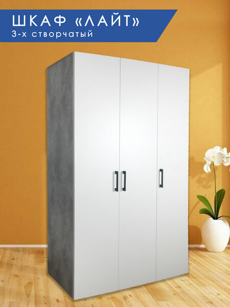 Шкаф трехстворчатый Лайт – стильное и практичное решение для хранения вещей. Изготовлен из качественных материалов, что обеспечивает его долговечность и надежность. Цвет цемента светлого и белого придает шкафу современный и стильный вид, который легко впишется в любой интерьер. Трехстворчатая конструкция шкафа позволяет удобно разместить все ваши вещи, а также обеспечивает быстрый доступ к ним. Мебель и Точка – известный бренд, который зарекомендовал себя на рынке мебели благодаря высокому качеству продукции и доступным ценам. Выбирая шкаф трехстворчатый Лайт, вы делаете ставку на надежность и стиль. Приобретая шкаф трехстворчатый Лайт, вы получаете стильное и функциональное решение для хранения вещей, которое прослужит вам долгие годы.