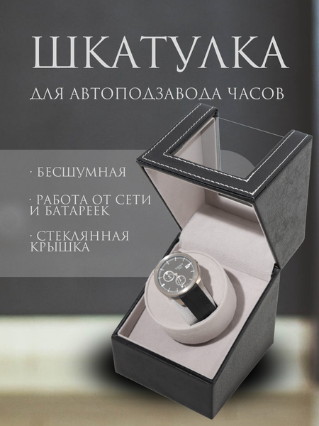 Для исправной работы часы необходимо регулярно заводить. Тайммувер для подзавода часов придумали еще в 18 веке. Автоматическая коробка для часов оснащена равномерно вращающейся чашей, способствующей постоянному заводу механизмов часов, имитирующим раскачку часового ротора на руке. Ремень в шкатулке будет расправлен по форме так, чтобы не образовывались заломы. Мягкие подкладки, обитые светлой тканью, предупреждают повреждение часов. Часовая шкатулка выполнена из эко кожи и имеет декоративную прострочку на крышке. Бокс для часов обладает тихим режимом работы вращающегося механизма. Вотчвиндер — практичная вещь, которая сохраняет ваши часы от пыли, влаги и сокращает износ механизма часов, и стильный элемент в декоре интерьера. Коробка для часов обеспечивает удобное хранение и транспортировку хронометров. Особенно актуальна шкатулка для часов с автоподзаводом, если в коллекции есть модели со сложными функциями: календари, фазы Луны, часовые пояса. Органайзер для хранения часов с автоподзаводом станет отличным подарком и для мужчин, и для женщин. Комплектация: к шкатулке для механических часов идет кабель с евро розеткой длинной 1,3 м.