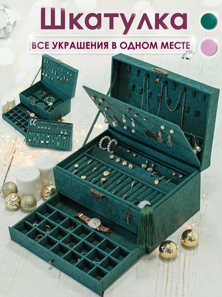 Ключик Вы найдёте за полотном для сережек. Шкатулка для украшений это стильный и практичный аксессуар, который поможет вам хранить и организовывать вашу коллекцию. Красивый органайзер для украшений - удобный кейс для хранения женских изделий серьги кольца подвески камни браслеты. Подарочная большая шкатулка для драгоценностей с отделениями позволяет разместить украшения женшин разных размеров. Органайзер для бижутерии обтянут изнутри и снаружи качественной бархатистой фланелью для мягкого и бережного хранения украшений и золота. Многоуровневая бархатная шкатулка оснащена замком и ключом. Полотно для гвоздиков разделяет крышку и верхний ярус на два отсека. Верхний лоток многосекционного сундука закрывается на ключик. На крышке имеются кармашек из ткани на резинке для мелочей и крючки петли для цепочек подвесок. Верхняя полочка состоит из валиков из бархата для колец и подставки для сережек -гвоздиков. Нижний выдвижной ящик с ячейками под браслеты часы бусы. Перегородки разделители съёмные, что делает ее многофункциональной. При желании можно убрать и использовать бокс для больших изделий колье ожерелья фамильные ценности. Оригинальная шкатулка из велюра изумрудного цвета отлично впишется в декор интерьера Вашего дома. Прекрасный подарок любимой девушке жене маме девочке на люьой праздник, например 8 марта. Храните свои украшения удобно и красиво в одном месте!
