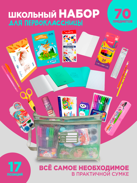 Готовый школьный набор Alfa Monet - идеальное решение для первоклассников и учеников начальных классов. В комплекте 70 предметов: цветные карандаши, краски, тетради, обложки, пенал, клей, ножницы и многое другое. Всё уже собрано в удобной сумке, чтобы родители сэкономили время, а дети начали учёбу с радостью! Готовиться к школе стало проще! Полный школьный набор Alfa Monet создан специально для первоклассников и учеников начальных классов. Вам больше не нужно бегать по магазинам в поисках каждой мелочи - всё самое необходимое собрано в одном удобном комплекте. Что входит в набор Alfa Monet (70 предметов): • Цветные двусторонние карандаши для ярких рисунков 24 цветов-1 шт • Клей-карандаш для аппликаций и поделок - 1 шт • Пластиковые безопасные ножницы -1 шт • Складная линейка, удобная для пенала-1 шт • Перламутровые акварельные краски 8 - • Набор обложек для тетрадей -25 шт защита и порядок -1 пачка -Классический чёрный карандаш -2 шт • Тетрадь Гознак — для чистописания -5 шт • Точилка со стирательной резинкой-1 шт • Альбом для рисования на 24 листа -1 шт • Тетрадь 12 листов в клетку -5 шт • Цветная бумага и цветной картон для творчества 18 листов -1 шт • Набор цветных ручек 9 цветов -1 шт • Пластиковый пенал с отделениями -1 шт • Шариковые ручки для ежедневных записей -2 шт • Классический пластилин 8 цветов -1 шт • Папка для тетрадей и др канцелярских принадлежностей -1 шт, выбор цвета и дизайна папки не предоставляется. Почему выбирают Alfa Monet: Экономия времени и денег - всё уже в комплекте Безопасные и качественные материалы Универсальный набор для мальчиков и девочек Помогает развивать творческие способности и самостоятельность - Полный комплект «под ключ» - не нужно ничего докупать - Безопасные материалы, подходящие для детей - Подходит для всех школьных предметов и творчества - Удобная сумка для хранения и транспортировки - Прекрасный подарок к 1 сентября