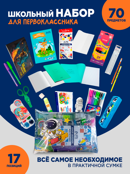 Готовый школьный набор Alfa Monet - идеальное решение для первоклассников и учеников начальных классов. В комплекте 70 предметов: цветные карандаши, краски, тетради, обложки, пенал, клей, ножницы и многое другое. Всё уже собрано в удобной сумке, чтобы родители сэкономили время, а дети начали учёбу с радостью! Готовиться к школе стало проще! Полный школьный набор Alfa Monet создан специально для первоклассников и учеников начальных классов. Вам больше не нужно бегать по магазинам в поисках каждой мелочи - всё самое необходимое собрано в одном удобном комплекте. Что входит в набор Alfa Monet (70 предметов): • Цветные двусторонние карандаши для ярких рисунков 24 цветов-1 шт • Клей-карандаш для аппликаций и поделок - 1 шт • Пластиковые безопасные ножницы -1 шт • Складная линейка, удобная для пенала-1 шт • Перламутровые акварельные краски 8 - • Набор обложек для тетрадей -25 шт защита и порядок -1 пачка -Классический чёрный карандаш -2 шт • Тетрадь Гознак — для чистописания -5 шт • Точилка со стирательной резинкой-1 шт • Альбом для рисования на 24 листа -1 шт • Тетрадь 12 листов в клетку -5 шт • Цветная бумага и цветной картон для творчества 18 листов -1 шт • Набор цветных ручек 9 цветов -1 шт • Пластиковый пенал с отделениями -1 шт • Шариковые ручки для ежедневных записей -2 шт • Классический пластилин 8 цветов -1 шт • Папка для тетрадей и др канцелярских принадлежностей -1 шт, выбор цвета и дизайна папки не предоставляется. Почему выбирают Alfa Monet: Экономия времени и денег - всё уже в комплекте Безопасные и качественные материалы Универсальный набор для мальчиков и девочек Помогает развивать творческие способности и самостоятельность - Полный комплект «под ключ» - не нужно ничего докупать - - Безопасные материалы, подходящие для детей - Подходит для всех школьных предметов и творчества - Удобная сумка для хранения и транспортировки - Прекрасный подарок к 1 сентября