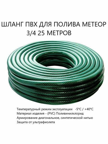 Трехслойный, армированный шланг для полива, перекачки и прочих работ с жидкостями, в том числе с пищевыми. Внутренний слой ПВХ непрозрачный, черный, защищает от проникновения солнечных лучей и препятствует образованию водорослей внутри тела шланга. Наружный ПВХ слой прозрачный, окрашенный в зеленый цвет. При производстве используют специальные защитные добавки от воздействия внешних факторов, таких как ультрафиолетовое излучение, истирание. Между внутренним и наружным ПВХ слоями проложен высокопрочный плетеный корд из высокопрочной синтетической нити. Благодаря повышенным качественным показателям этот вид шланга имеет более высокие эксплуатационные характеристики (не заламывается и не перегибается). Характеристики: - Материал изделия: (PVC) Поливинилхлорид - Рабочее давление: до 6 бар (атм) - Давление на разрыв: 13 бар (атм) - Температурный режим эксплуатации: -5°С / +50°С - Вредные вещества (Cd), барий (Ba), свинец (Pb) отсутствуют Прочие характеристики: - Диаметр: 3/4" - Длина: 25.0 м - Цвет товара: зеленый - Вид садового шланга: Поливочный - Рабочее вакуум: 6.0 бар - Тип: шланг - Особенности: подходит для пищевых продуктов, устойчив к УФ-излучению, не содержит тяжелых металлов - Назначение: поливочный - Тип шланга: армированный Выбирая этот шланг, вы получаете надежный и долговечный инструмент для полива и перекачки жидкостей, который будет служить вам долгие годы.