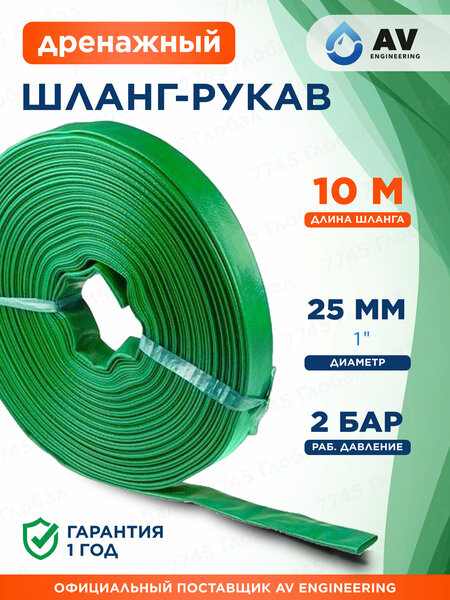 Шланг-рукав дренажный AV ENGINEERING ПЭ 1" 10 м (AVE9011025) - напорный рукав из полиэтилена. Шланги-рукава применяются с погружными насосами, мотопомпами, дренажными и фекальными насосами для перекачки как чистой так и грязной воды, фекальной канализации а также в качестве магистрального шланга в системах капельного полива. Особенности материала облегчают врезку капельной арматуры. Отличается дешевизной при большом диаметре и компактностью упаковки. В рабочем состоянии имеет круглое сечение. Рабочее давление: от 2 бар; Максимальное давление на разрыв: до 6 бар; Рабочая температура: от 2 до 60 градусов по Цельсию.