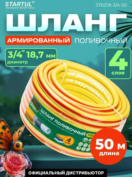 Шланг поливочный садовый армированный 3/4" 25 м, 4 слоя Startul Garden Profi из четырех слоев с одной армирующей оплеткой применяется для полива сада и огорода, перекачки и прочих работ с жидкостями. Шланг поливочный имеет 4-слойную структуру на основе эластичного суспензионного поливинилхлорида и других компонентов, улучшающих эластичность при низких температурах, армированный высокопрочной полиамидной нитью. Шланг садовый обладает повышенной герметичностью и стойкостью к расслаиванию, высокой эластичностью, устойчивостью к низким температурам. Шланг поливочный садовый имеет специальное покрытие, которое не дает ему перегибаться и перекручиваться. Шланг для полива устойчиво устойчиво к ультрафиолетовому излучению и имеет длительный процесс старения. Поливочный шланг изготовлен из материала, который устойчив к осаждению водорослей, не содержит кадмия, бария, свинца, не содержит фталат. Толщина стенки: 1,8 мм. Шланг садовый поливочный Шланг садовый поливочный используется в широком температурном диапозоне от -25°C до +60°C. Рабочее давление: 10 бар при соблюдении температурного режима эксплуатации при 20°C. Давление разрыва (максимальное давление): 30 (при 20°C). Рекомендации по использованию: перед хранением необходимо слить воду.