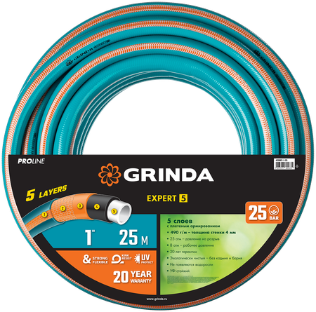 Шланг поливочный, армированный, 5-ти слойный 5 1/2", 20 м, 35 атм, GRINDA PROLine EXPERT 429007-1/2-20 Поливочный пятислойный шланг GRINDA PROLine EXPERT 1/2", 20 м, 35 атм 429007-1/2-20 подходит для орошения дачного участка. Надежность. Выполнен из пяти слоёв армированного полиамидными нитями ПВХ, который отличается устойчивостью к воздействию солнца, износостойкостью и не перекручивается при использовании. Сохраняет свою гибкость при высоких и низких температурах в диапазоне от -20 до +50°С. Безопасность. Не содержит кадмий и барий, безопасен для окружающей среды и человека. *Компания-производитель оставляет за собой право на изменение комплектации и места производства товара без уведомления дилеров! *Указанная информация не является публичной офертой.