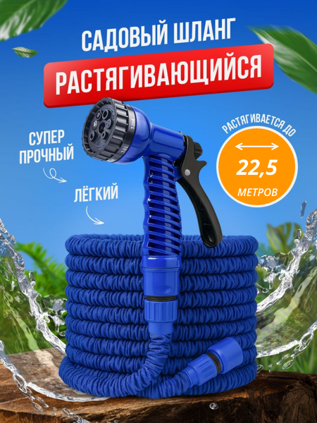 Шланг поливочный растягивающийся до 22 метров, синий, для полива, садовый с фитингами и распылителем