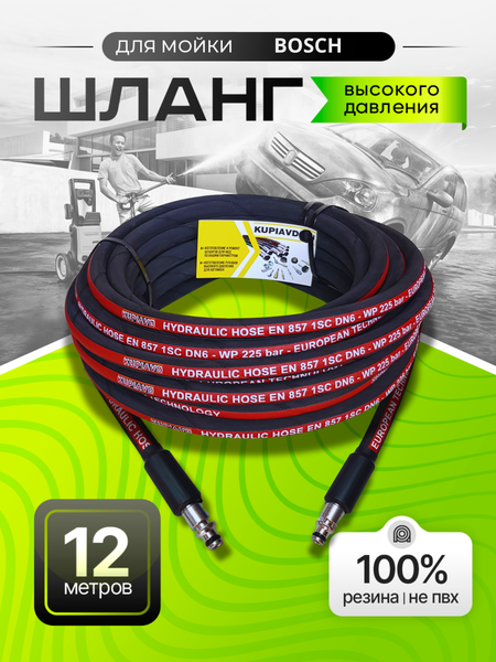 Шланг высокого давления для бытовых минимоек Bosch EasyAquatak, UniversalAquatak, AQT 33-10, AQT 33-11, AQT 35-12, AQT 37-13, AQT 40-13, AQT 42-13, 100 Long Lance, 120, 125, 130, 130 Car Kit, 135. Выполнен из гидравлического шланга стандарта EN 857 DN06 1SC. Имеет внутренний диаметр 6 мм, изготовлен из двухслойной мягкой резины с металлической однослойной оплеткой. Внешний диаметр 12 мм. Рабочее давление 225 бар, максимальное давление на разрыв - 900 бар. Тип подключения к мойке - штуцер системы Quick connect. Тип подключения к пистолету - штуцер системы Quick connect. Идеально для мойки автомобилей, квадроциклов, мотоциклов, террас, садовой техники и не только. Внимание! Не совместим с минимойками Bosch, оснащенных катушками смотки шланга.