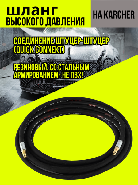 Шланг высокого давления dn6 (диаметр 6мм), длиной 10м, армированный одной стальной оплеткой, с штуцерами Karcher Quick Connect с двух сторон. Подходит для бытовых моечных аппаратов Karcher серии K (K2-K7), начиная с 2009г выпуска. Рабочее давление 225 bar, двукратный запас давления на разрыв. Большой срок службы при бережном обращении.