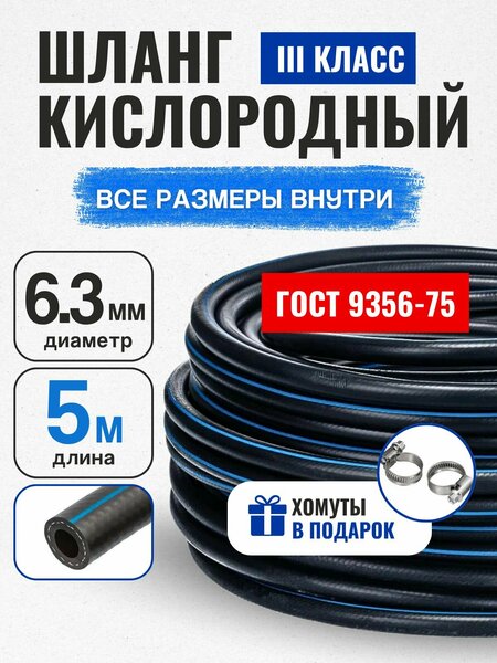 ГОСТ 9356-75 Шланг/рукав кислородный для газовых баллонов внутренний диаметр 6,3 мм (III класс-6,3-2,0 МПа) 5 метров Шланг резиновый, кислородный , газовый с кордом. Шланг состоит из нитяного каркаса, внутреннего и наружного резинового слоя. Цвет черный. Используется для подачи кислорода, ацетилена, воздуха и воды. Благодаря высокой прочности и долговечности отлично подходит для дачных газовых баллонов, компрессоров и т. д. а так же для полива. При использовании не перекручивается, заломы не остаются. . В зимний период остается гибким и эластичным, а вода летом не зацветает и водоросли не образуются.