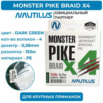 Шнур Nautilus Monster Pike Braid X4 Dark Green - это плетеный шнур, разработанный специально для рыбалки с крупными приманками типа Swimbaits и Jerkbait. Изготовлен из высококачественных сверхвысокомолекулярных полиэтиленовых волокон, он обладает плотным плетением и высокой абразивной устойчивостью. Шнур Nautilus Monster Pike Braid X4 Dark Green имеет зеленый цвет и диаметр 0.38 мм. Разрывная нагрузка составляет 31.7 кг, что делает его подходящим для использования с мультипликаторными катушками и мощными удилищами. Шнур обладает рядом преимуществ, которые делают его незаменимым помощником для рыболовов. Он обладает отсутствием «памяти» и «нулевым» растяжением, что обеспечивает высокую точность заброса и уверенное вываживание рыбы. Шнур Nautilus Monster Pike Braid X4 Dark Green подходит для различных видов ловли, включая джиговую, на голавля, на жереха, на осётра, на речного окуня, на сома, на стерлядь, на судака, на толстолобика, на форель, на хариус и на хищника. Шнур произведен в Китае, что гарантирует его высокое качество и доступность. В упаковке поставляется одна штука. Выбирая шнур Nautilus Monster Pike Braid X4 Dark Green, вы получаете надежный и качественный продукт, который станет незаменимым помощником на рыбалке.