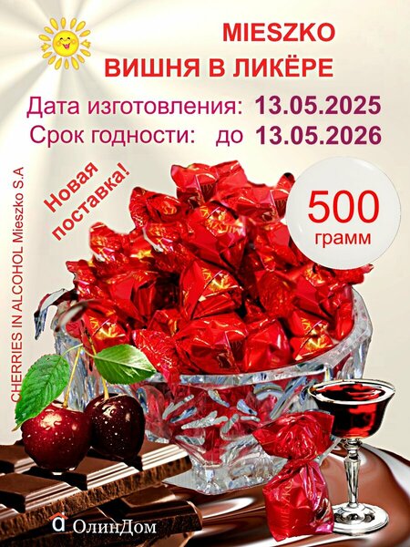 Новая партия. Прямой импорт. Дата изготовления: 13.05.2025г. Срок годности: до 13.05.2026г. Шоколадные конфеты "Вишня в ликёре" кондитерской компании Mieszko S. A.- это изысканное сочетание вкуса и аромата, дарящее праздничное настроение. Многие называют эти десертные сладости - "Пьяная вишня". Внутри каждой конфеты из темного шоколада находится сочная цельная вишня с алкогольным ликёром. Благодаря такому уникальному рецепту, шоколадные конфеты, бренда Mieszko обладают ярким, насыщенными и интересным вкусом с пикантными нотками. Премиальное качество шоколадных конфет идеально подходит для подарка на день рождения, 14 февраля, 23 февраля, 8 марта или для себя. Даже в развес каждая конфета завернута в красивую, блестящую, подарочную обертку. Конфеты содержат алкоголь и не предназначены для детей и беременных женщин! Для обеспечения сохранности и идеального состояния конфет, Ваш заказ мы упакуем в целлофановый пакет с клапаном, транспортировочный короб из гофрокартона и зафиксируем особым скотчем с надписью "осторожно хрупкое" для более осторожного обращения транспортными службами. P. S. Крайне редко, но в вишне может попасться косточка. Краткая справка Кондитерская компания Mieszko S. A. была основана в 1993 году благодаря слиянию кондитерских компаний Ślązak и Raciborzanka. Фабрика Mieszko расположена в городе Ратибор, в воеводстве Силезия. Mieszko (Миешко) - одно из известнейших в Польше производителей кондитерских изделий премиального качества. Неординарные рецептуры, высококачественные компоненты и элегантное праздничное оформление сделали сладости Mieszko популярными и любимыми во многих странах мира.